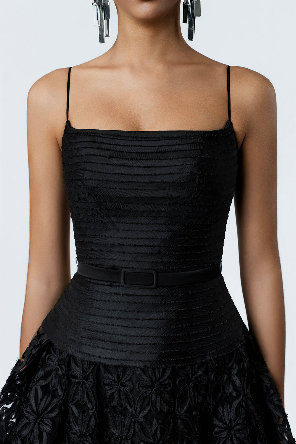 A spaghetti strap A-line mini dress crafted from unique floral-patterned lace that creates vivid, exquisite visual effects. The bodice features laser-cut poly silk, meticulously hand-assembled stitch by stitch through multiple intricate steps. The carefully calculated silhouette maximizes hip flattering, delivering soft, feminine curves. The overall design is edgy yet alluring and mysterious, a perfect choice for those who appreciate modern beauty with classic undertones.
