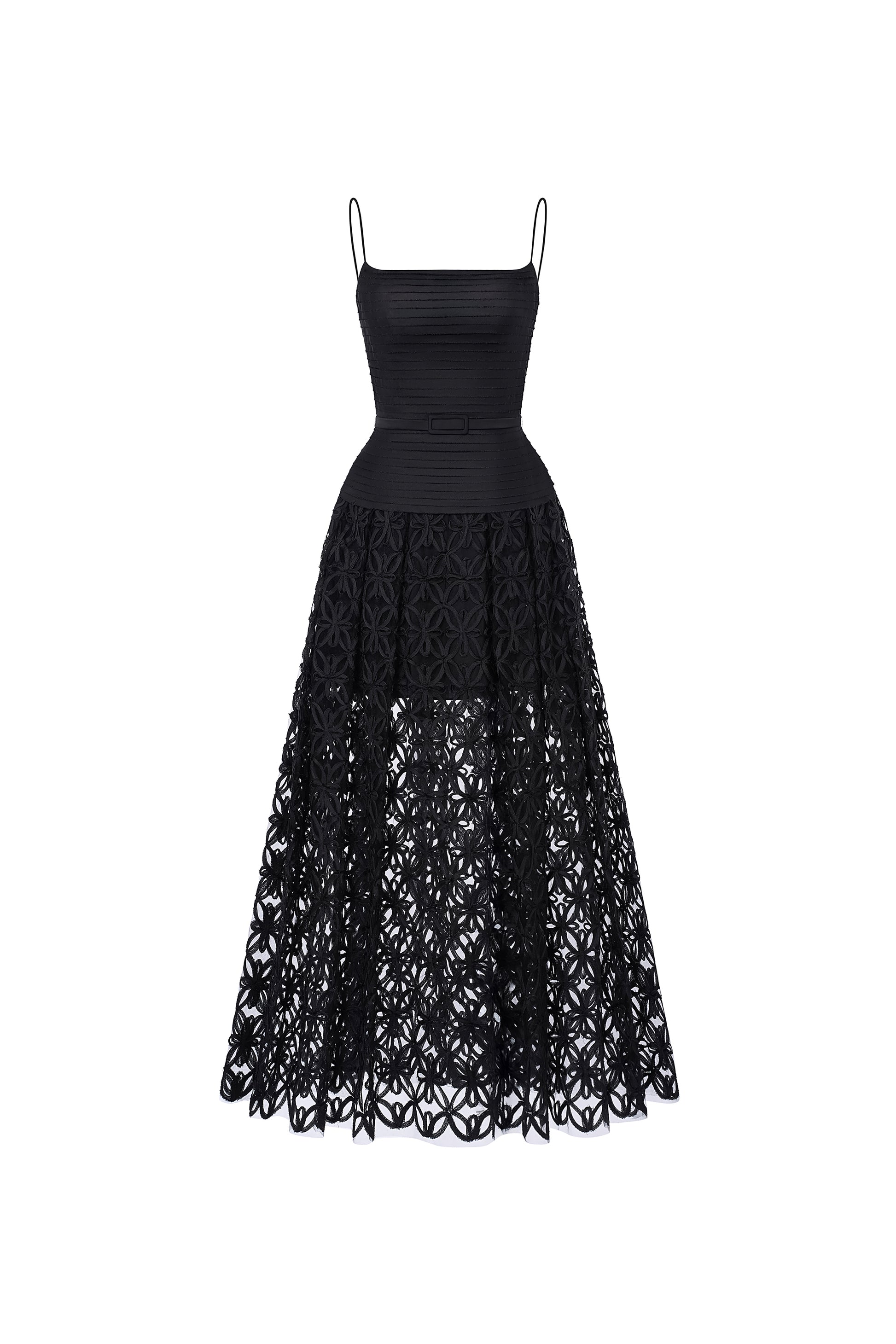 A spaghetti strap maxi dress with A-line silhouette, crafted from unique floral-patterned lace that creates vivid, exquisite visual effects for the skirt. The bodice features laser-cut poly silk, meticulously hand-assembled stitch by stitch through multiple intricate steps. The carefully calculated silhouette maximizes hip flattering, delivering soft, feminine curves. The overall design is edgy yet alluring and mysterious, a perfect choice for those who appreciate modern beauty with classic undertones.