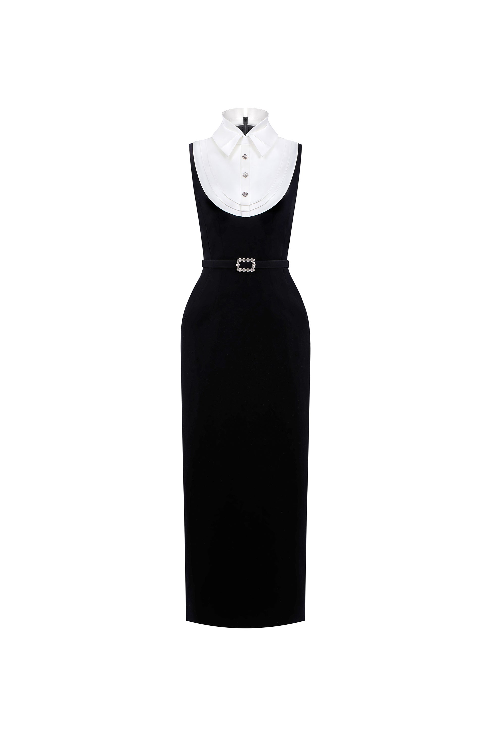 A figure-skimming maxi dress with straight hem, crafted from premium poly-wool that maintains structure while flattering body curves. The design features an elaborate layered collar with contrasting white trim on black, creating an elegant focal point with classic undertones. Crystal-embellished buttons and belt buckle deliver a sophisticated, refined effect. Internal hip padding enhances natural curves and creates a soft hourglass silhouette. A design that embodies impeccable, modest yet powerful beauty—ideal for occasions demanding elegance and personality.