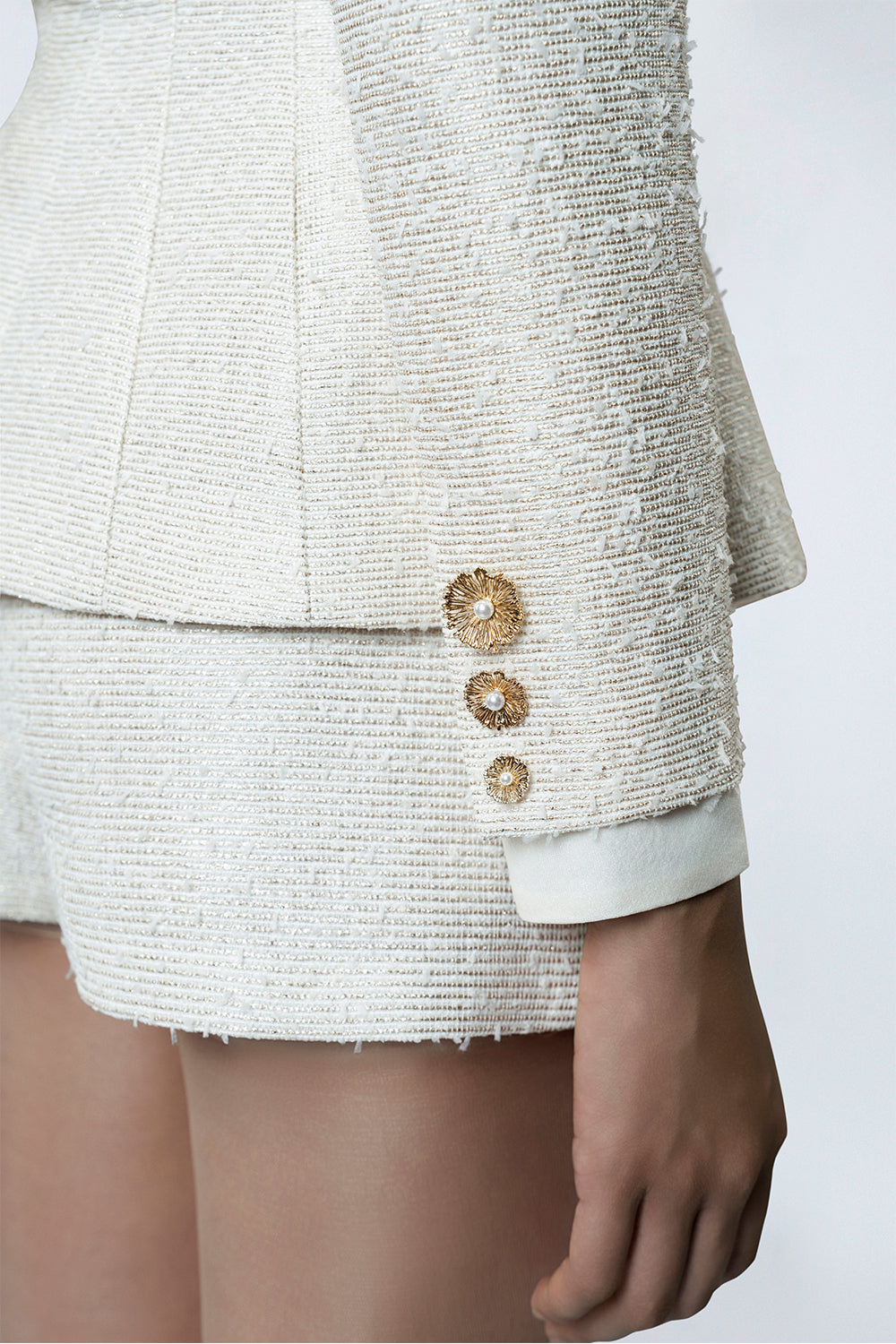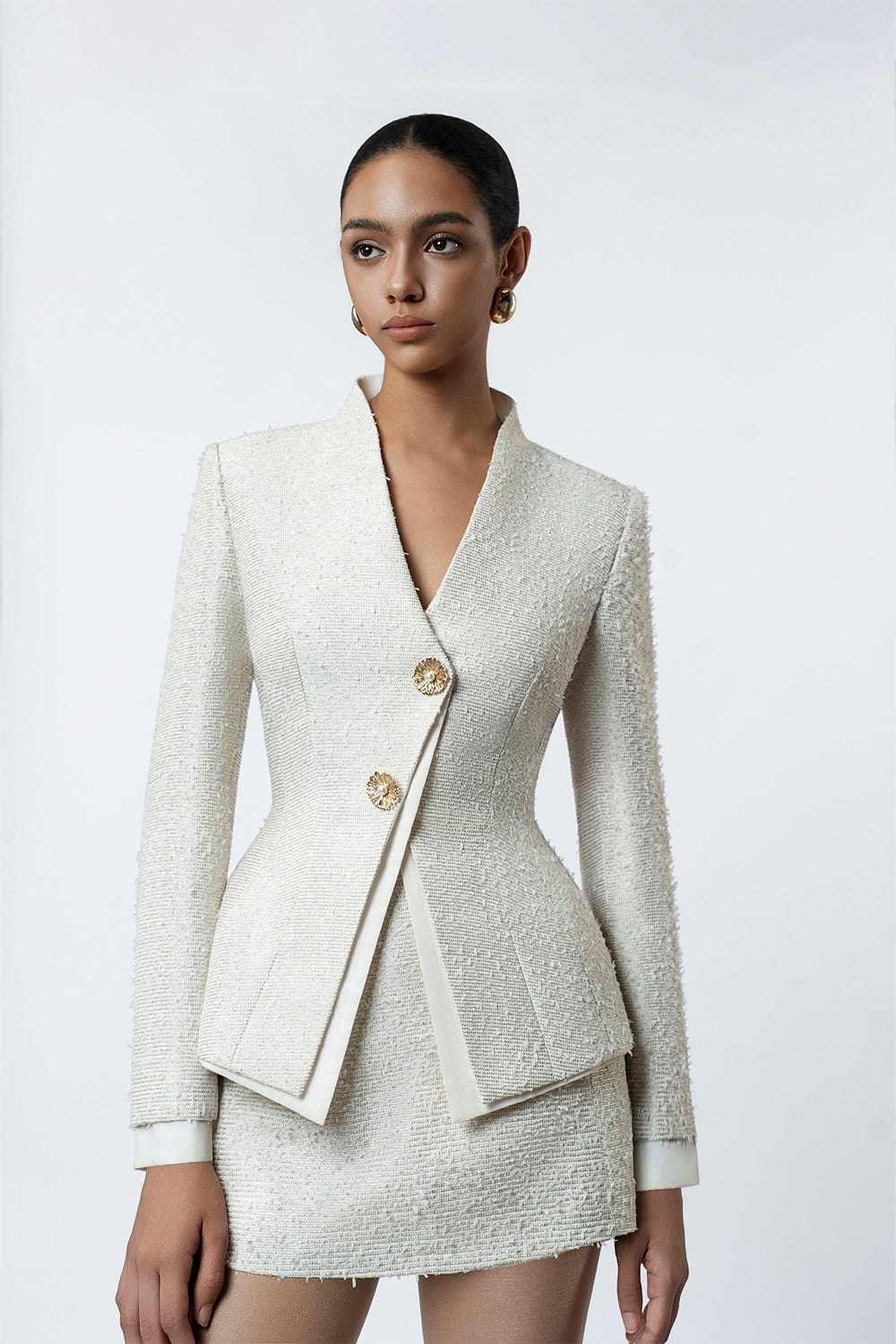 Mini skorts in premium tweed featuring bouclé texture with metallic threads, delivering a sophisticated yet relaxed feel with subtle shimmer in every movement. The gentle A-line flare flatters body curves while maintaining elegant refinement. A design embodying modern feminine spirit, perfectly paired with matching tweed blazer or silk blouse for an elegant, sophisticated appearance.