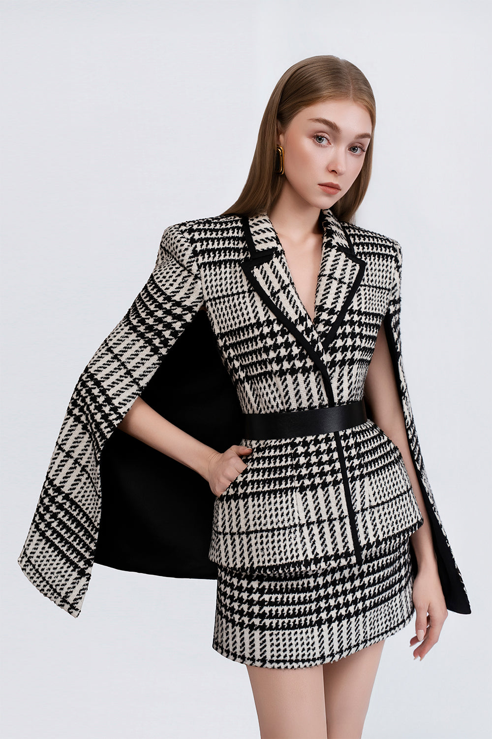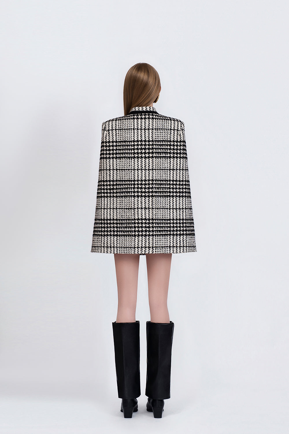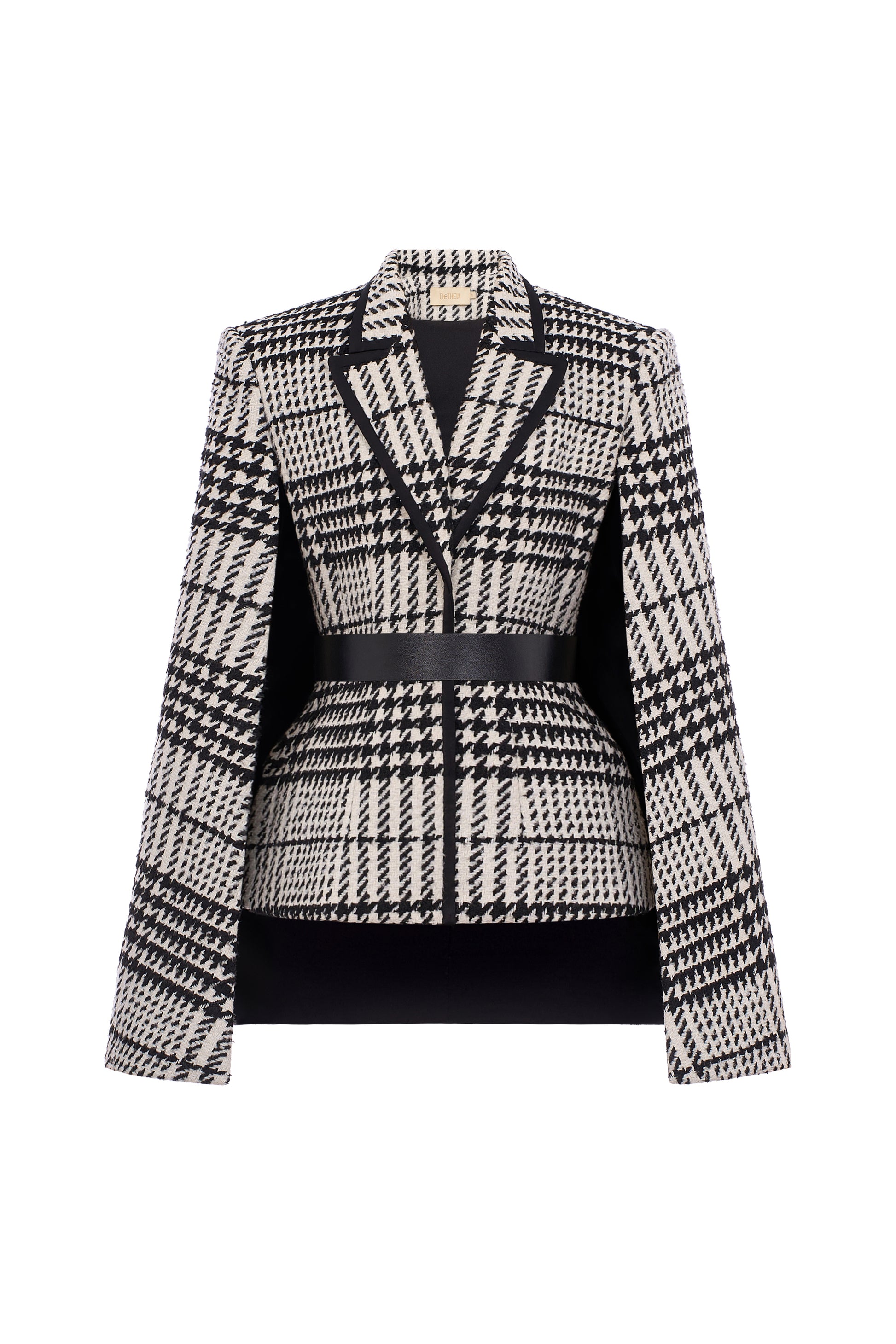 Inspired by the festive atmosphere of glamorous Paris during the Moulin Rouge era, Demi Cape carries a classic spirit renewed through modern language. The design features wool fabric with excellent warmth retention, in a cinched waist flared silhouette that flatters the figure. The classic houndstooth pattern is reimagined with rhythmic variations creating fresh, modern visual effects, combined with a contrasting silk collar trim that adds sophistication. The cape comes with a genuine leather belt exclusively designed by the brand, versatile for use with other outfits. Perfect for outings and strolls on cool days.