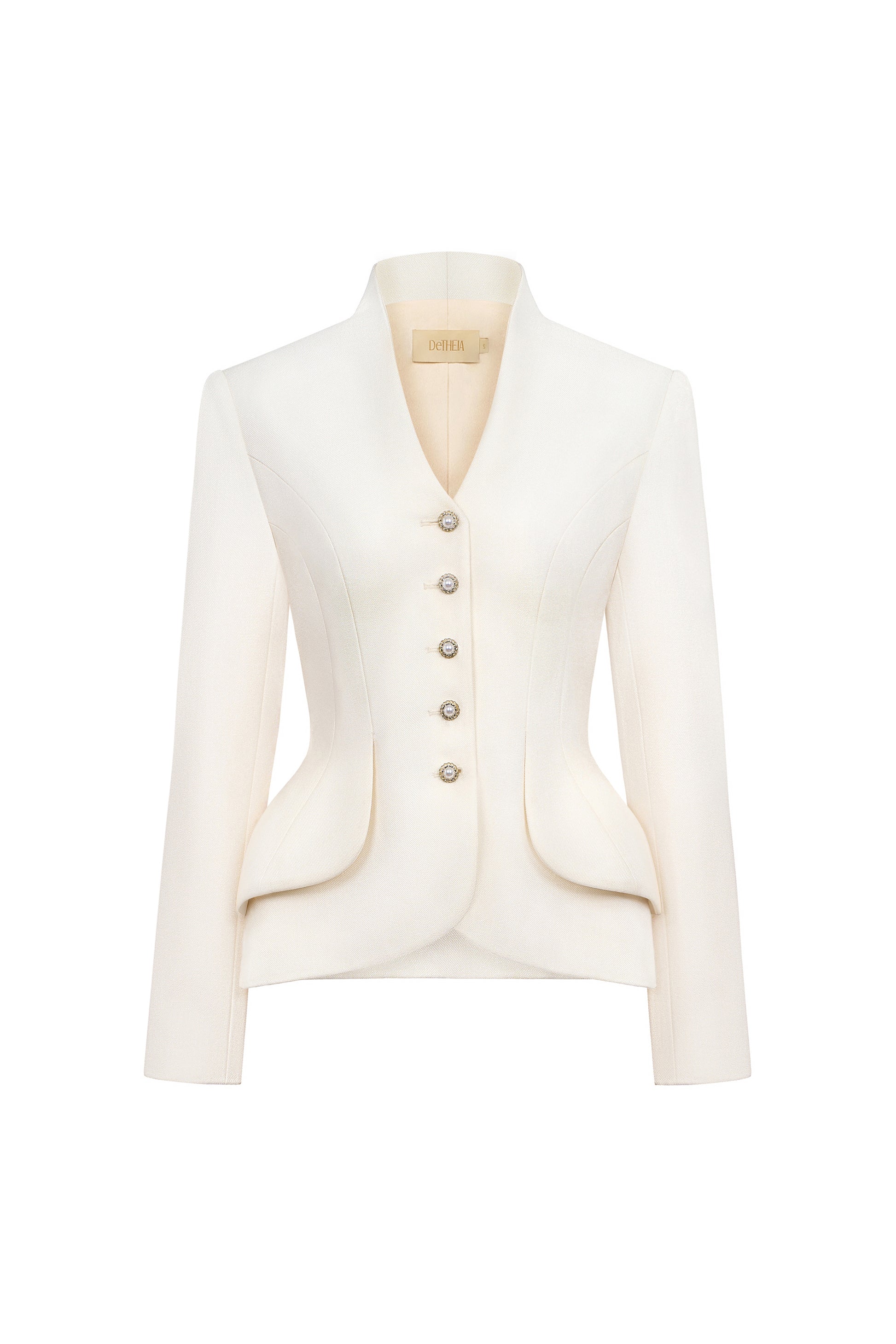 A blazer in premium poly-wool featuring a subtle shimmer surface, delivering sophistication and elegance with moderate structure yet soft drape. The curved hem and sleeves gently follow the body, accentuating a graceful, feminine silhouette. The layered hip structure creates a clever visual effect, making the waist appear slimmer while highlighting natural curves. Silver-rimmed pearl button accents add a soft, refined luminosity. Easily paired with long skirts or tailored trousers for a perfect ensemble for women who appreciate elegant, impeccable style with subtle distinction—suitable for gatherings, formal events, or light evening occasions.