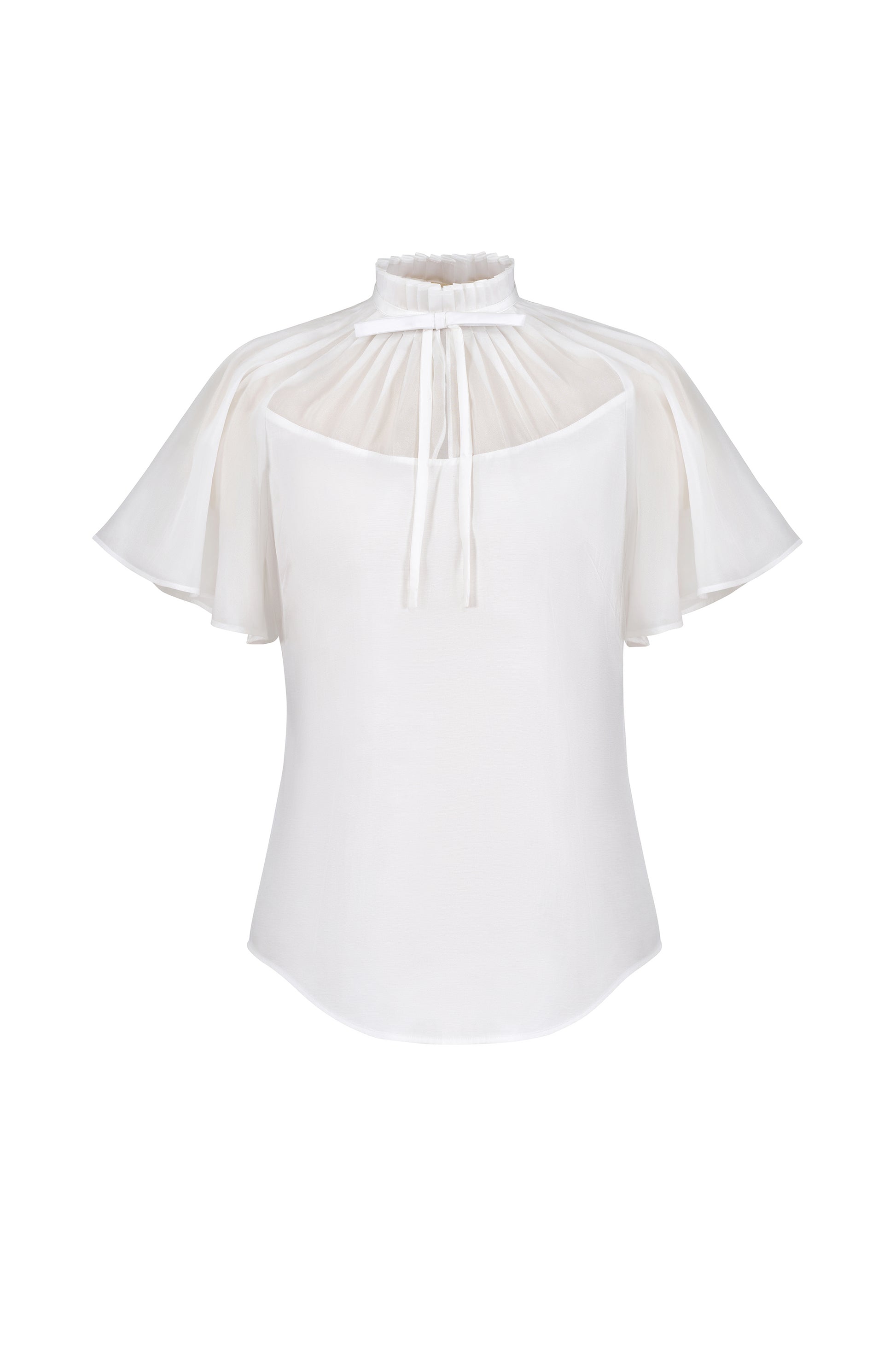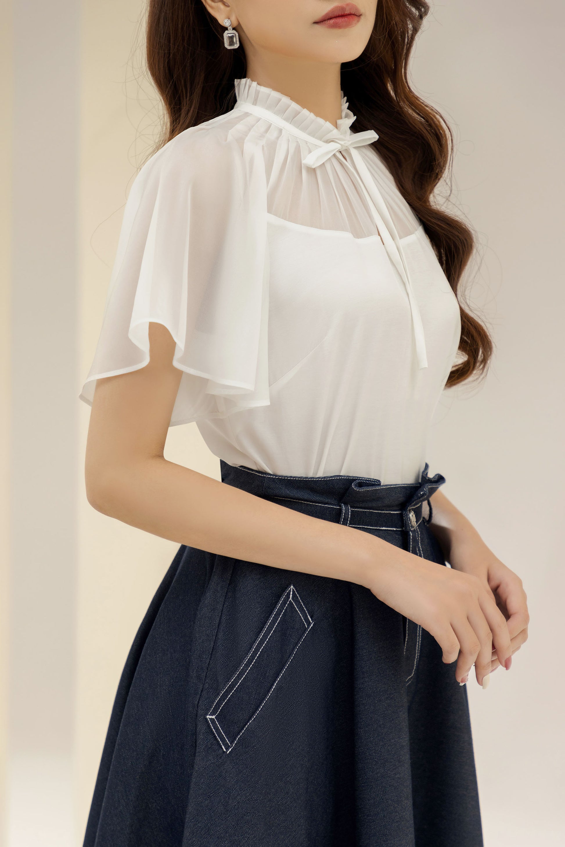 The Évora blouse is a fresh and pristine white piece. It features a loose-fitting design with a bow-tied neckline that cascades down to the chest, paired with eye-catching angel sleeves.