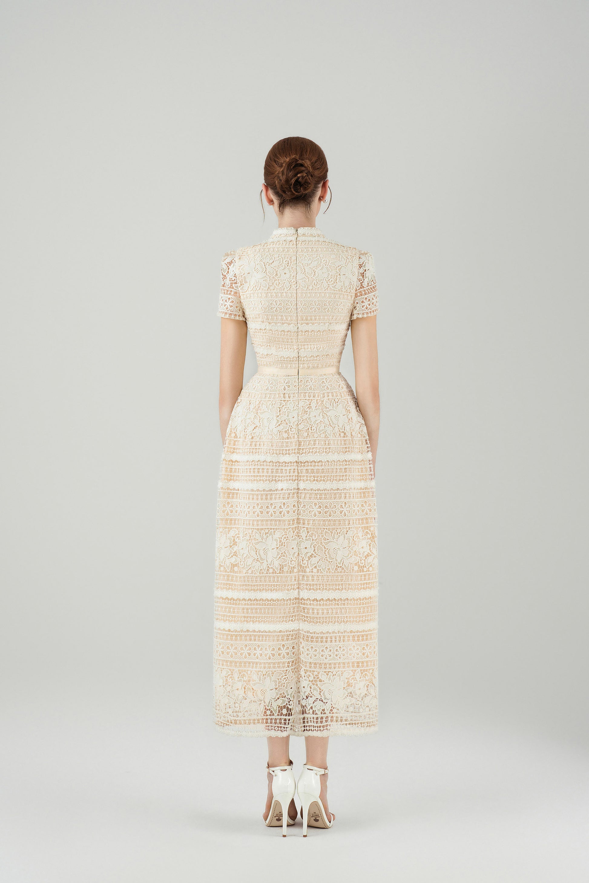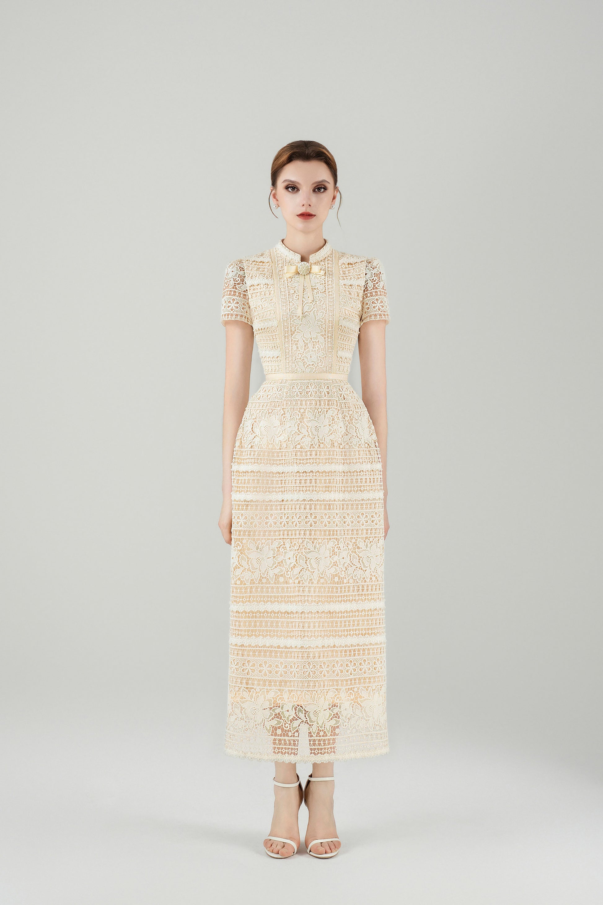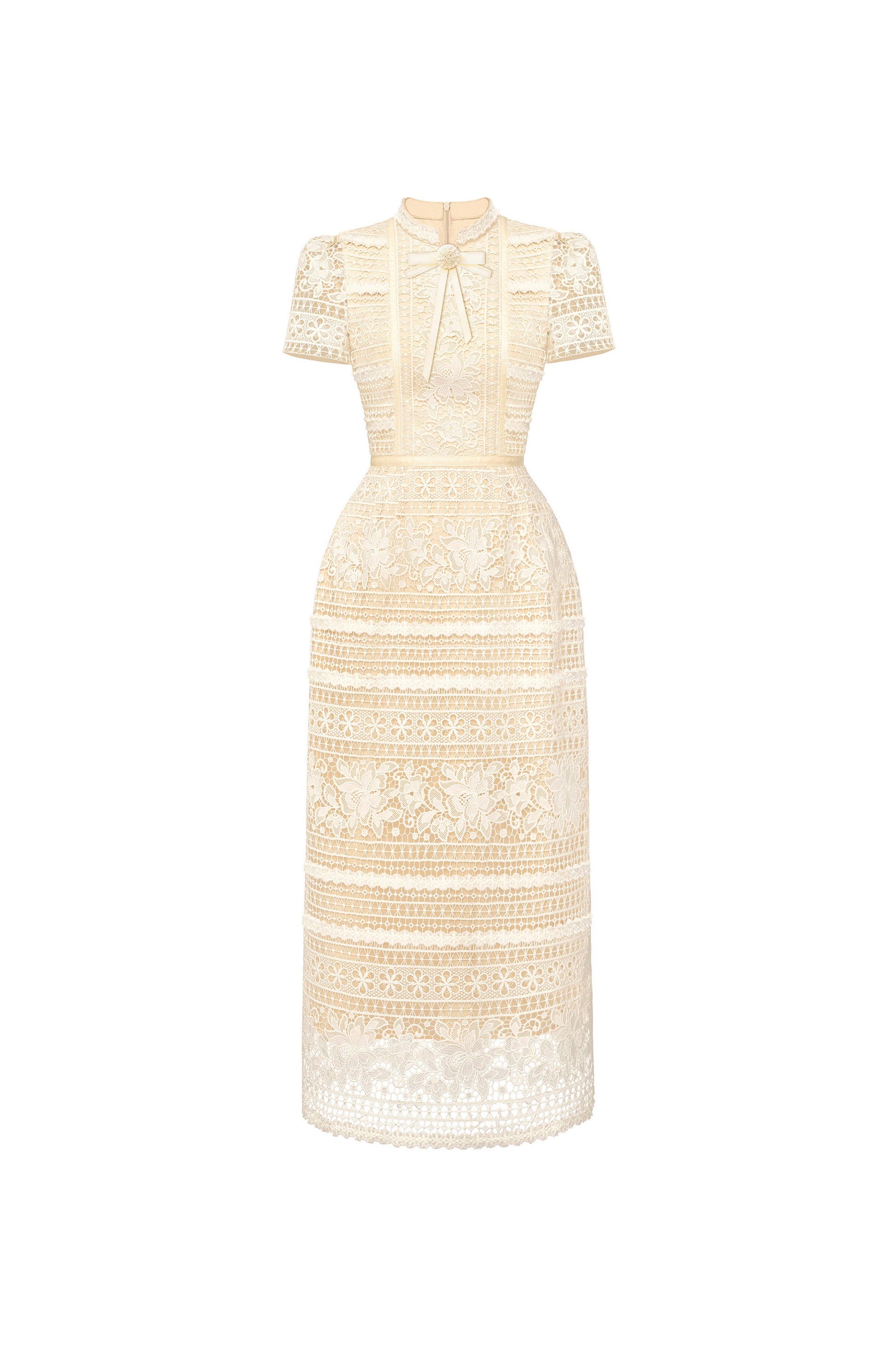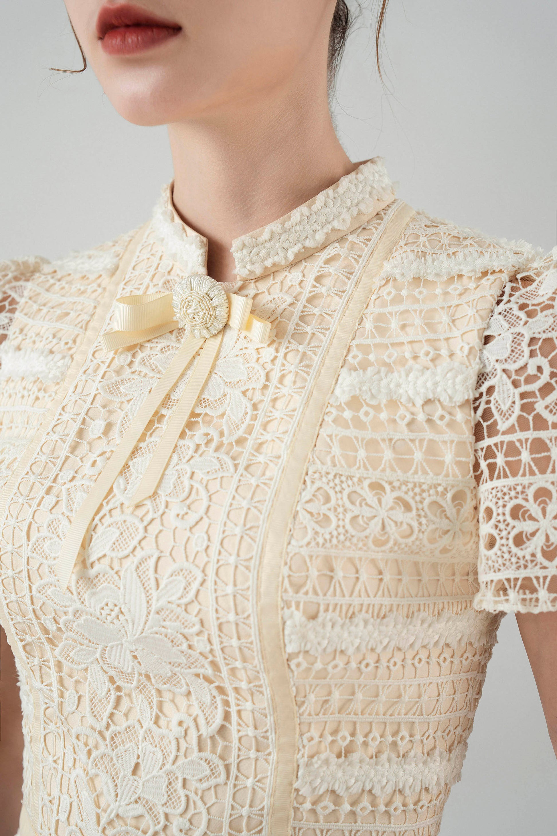 The sweetly feminine Giovanna dress features a gently flowing long silhouette, with the charming bow detail at the front neckline as the focal point. The delicate lace fabric with its unique and refined floral patterns exudes a graceful and feminine allure for the wearer. The dress also includes hip padding to accentuate the wearer's delicate figure.