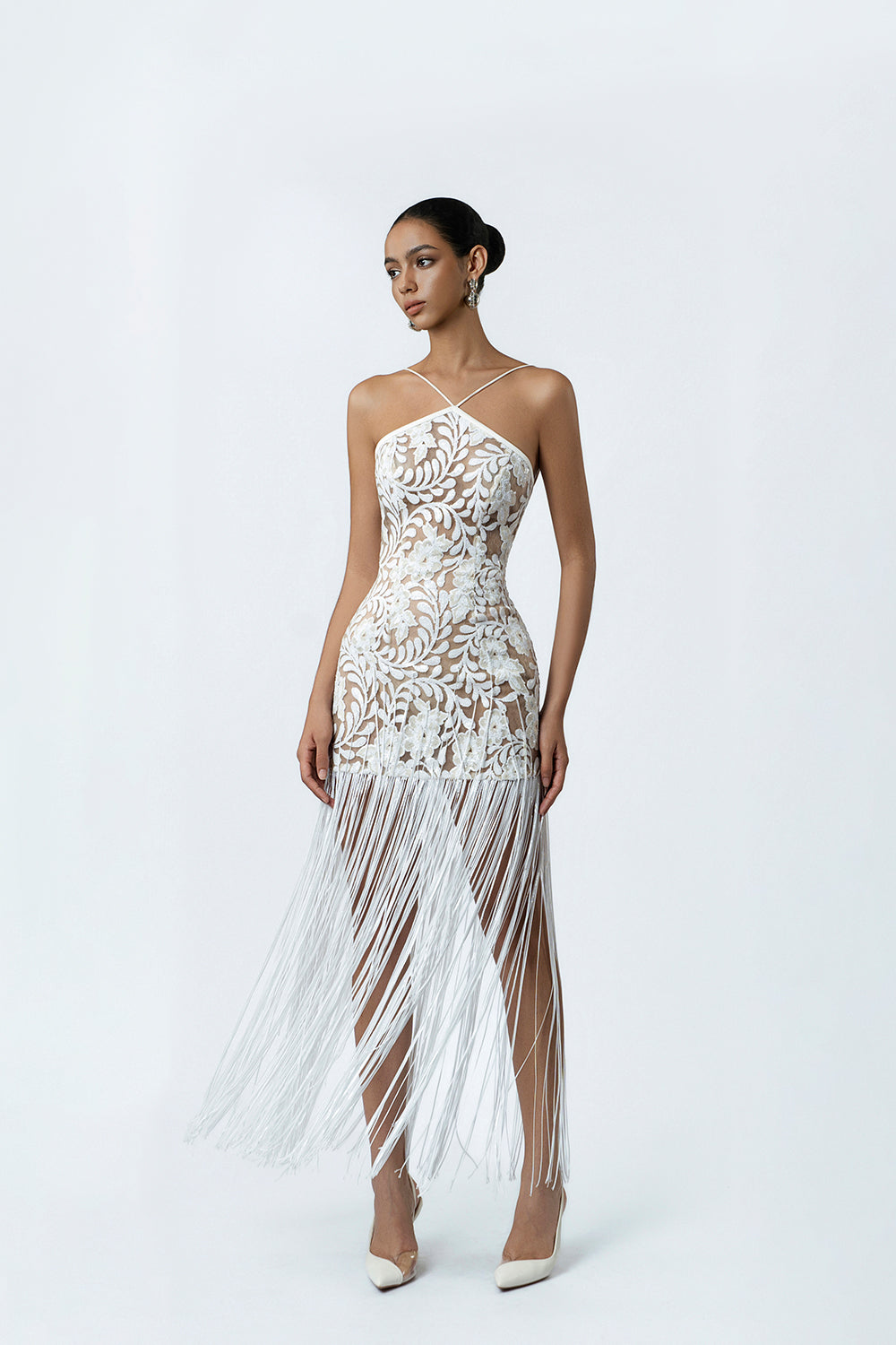 A figure-skimming maxi dress crafted from hand-embroidered sequin mesh with subtle shimmer and soft raised floral patterns, elegantly enhancing femininity. The silk-trimmed halter neckline is expertly finished, creating an elegant focal point that highlights shoulders and neckline. Meticulously sewn sequin fringe creates a graceful movement effect, catching light softly with every step for a vivid, captivating presence. The moderately deep open back allows the wearer to subtly showcase back curves while maintaining refined elegance. With its flattering silhouette and intricate handcrafted details, this dress is ideal for those who appreciate alluring, modern beauty. Perfect for cocktail parties, galas, or special events where the wearer wishes to leave an unforgettable impression.