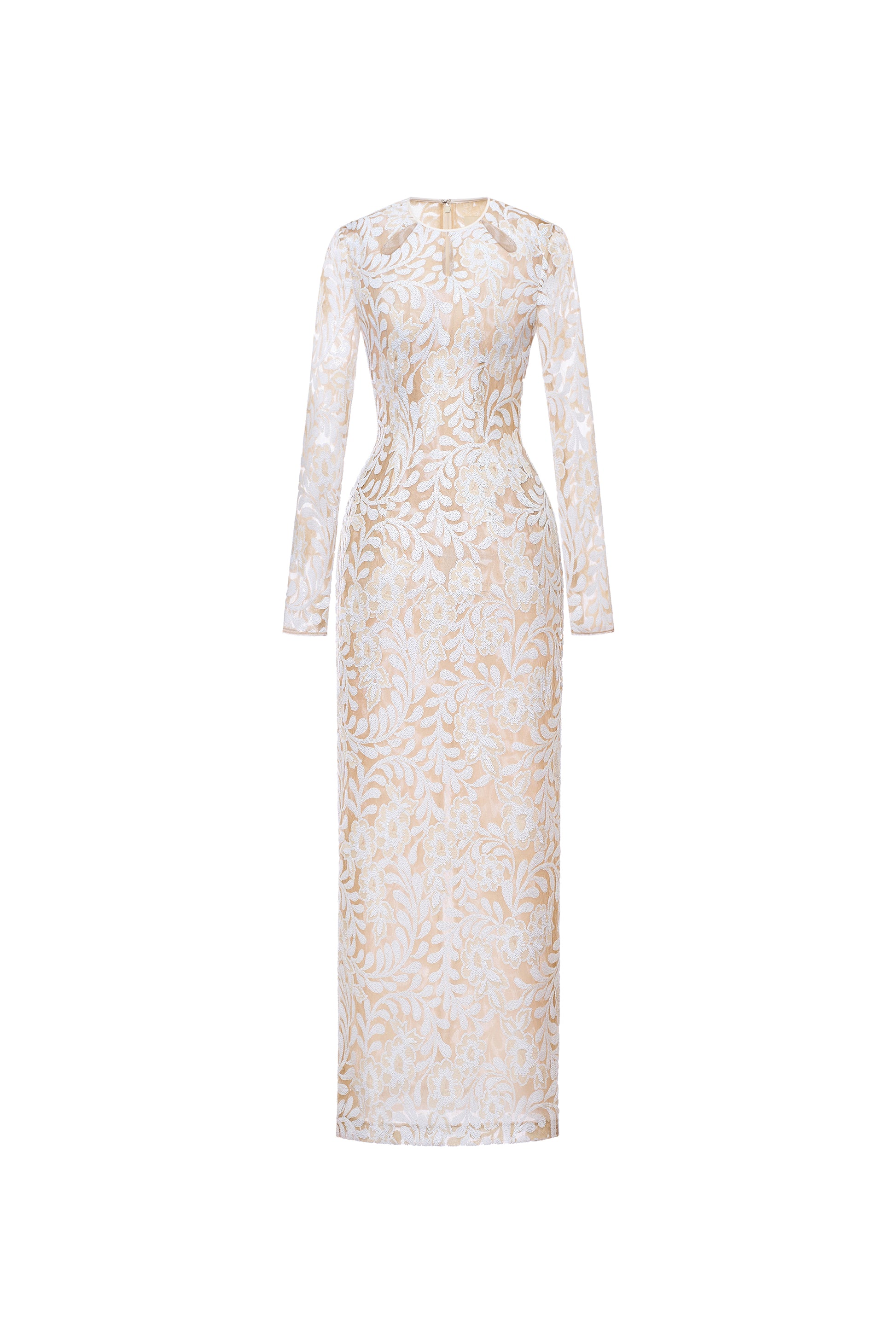 A figure-hugging maxi dress with long fitted sleeves, crafted from sequin-embroidered mesh featuring floral patterns that create a subtle sparkle effect on sheer fabric. The design includes internal hip padding to enhance curves and create a soft hourglass silhouette, maximizing the flattering fit. Meticulously tailored to hug the body while maintaining an elegant, refined appearance. The teardrop neckline adds an intriguing focal point to the overall design. Perfect for evening events or sophisticated soirées, embodying both modern and classic beauty.