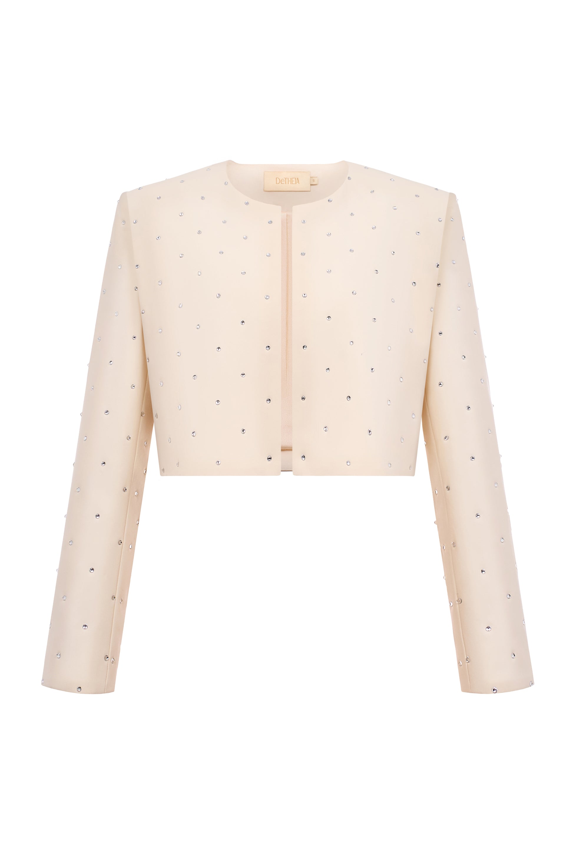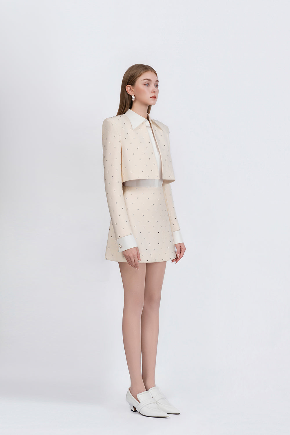 Inspired by the vibrant and free-spirited atmosphere of Moulin Rouge – the artistic symbol of Paris during the Belle Époque, where bolero dances and stage lights intertwined, creating an alluring spirit full of personality. The product uses crystal-studded poly-wool, with a short jacket silhouette featuring structured construction that delivers a polished, sophisticated feel. Combined with precise tailoring techniques, thin shoulder padding helps the body appear more balanced and harmonious. Moderate length and sensible loose fit allow for light layering without heaviness, while flattering body proportions. Versatile when worn over shirts or sweaters, paired with trousers or skirts, suitable for various occasions from strolling to events.