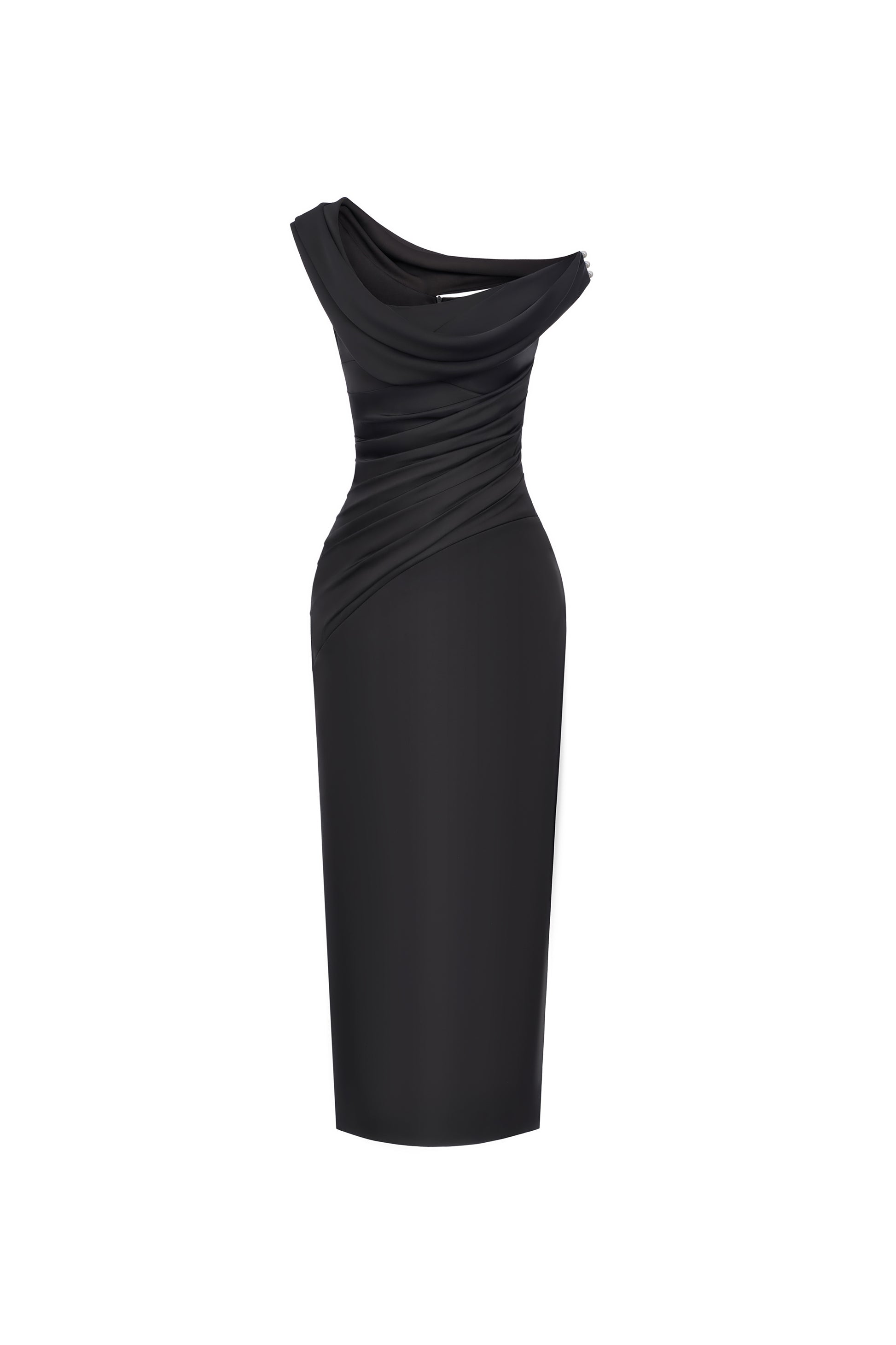 The Ottavia pencil dress with an off-the-shoulder neckline is inspired by the seductive and graceful beauty of the character Maria from the classic film The Barefoot Contessa, capturing the essence of an elegant, alluring, yet confident lady. Made from high-quality, thick silk, the design holds its shape while remaining soft, naturally accentuating the body’s curves. The sensual off-the-shoulder collar combined with the naturally gathered detailing at the waist creates a delicate visual effect, effectively concealing any imperfections while maintaining a luxurious and feminine look. The pencil silhouette hugs the body, and the exquisite pearl buttons on the shoulders add a touch of timeless sophistication, completing the outfit with a refined, classic appeal, while still exuding the youthful charm and grace of a modern lady.