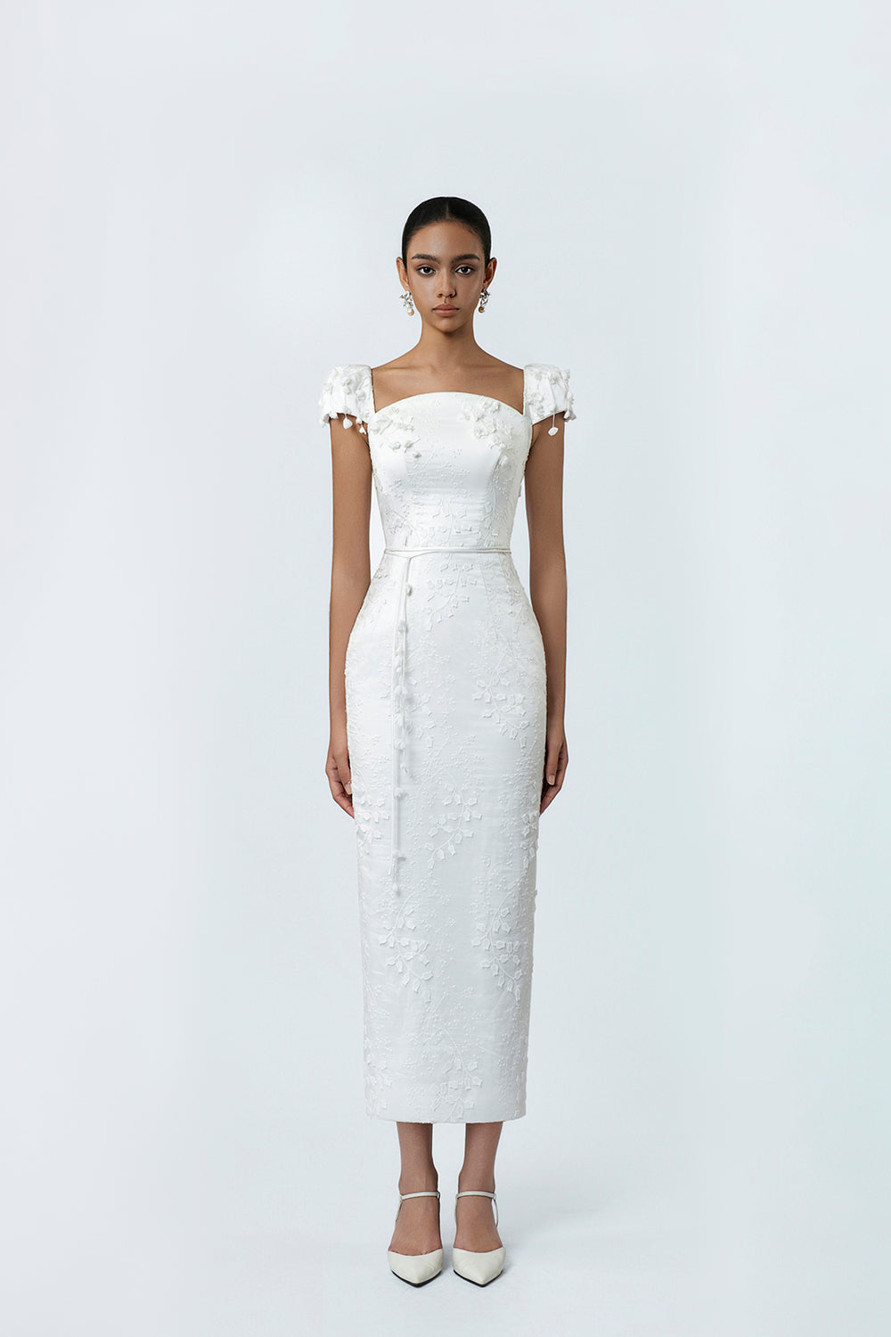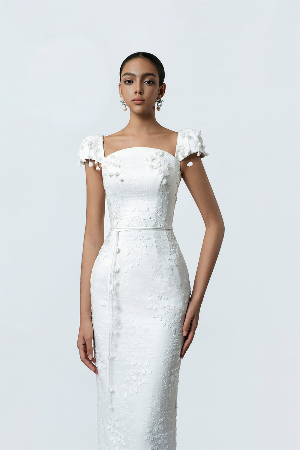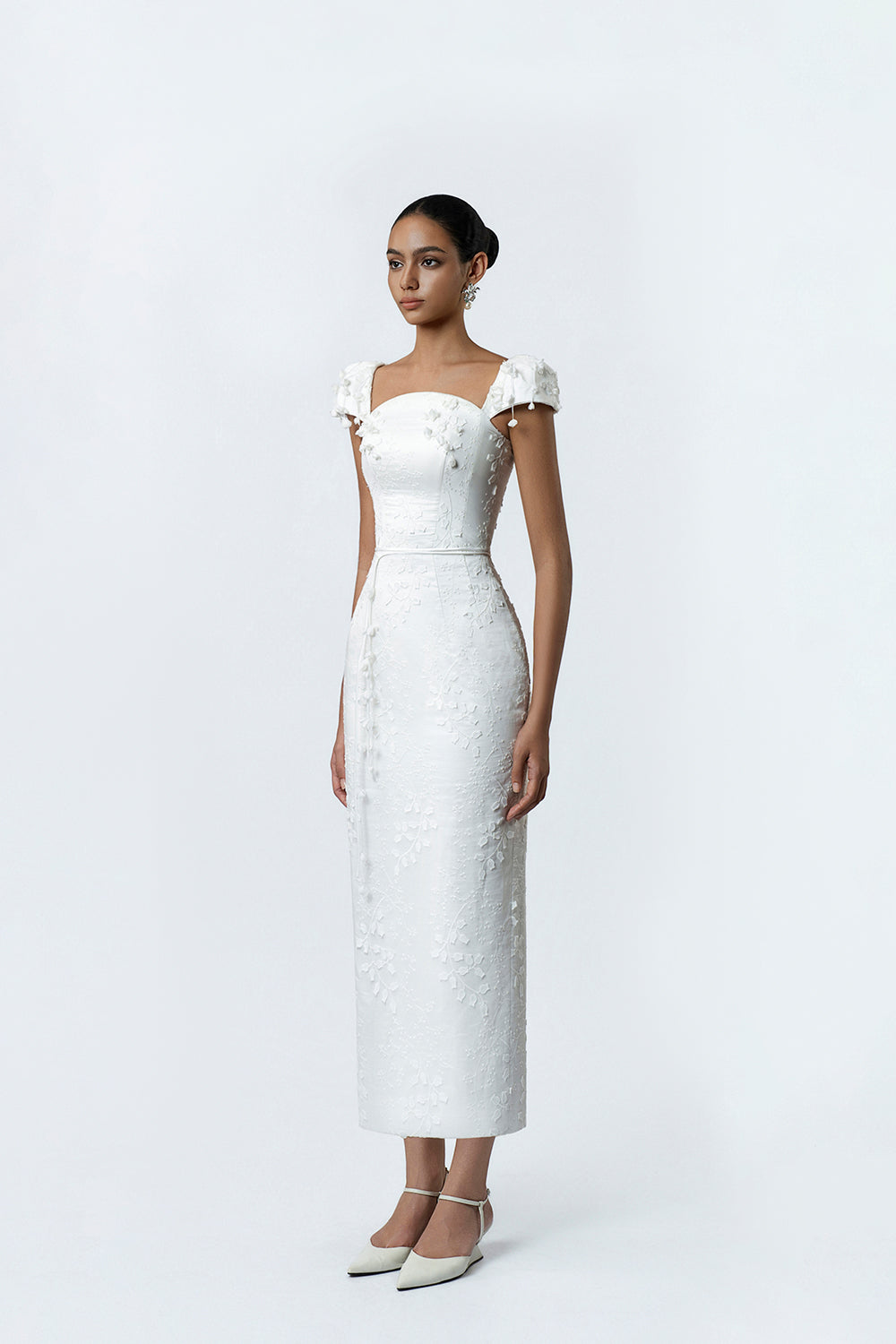 A pencil maxi dress crafted from premium embroidered silk featuring raised lily-of-the-valley motifs, delivering soft, pure beauty. The pencil silhouette accentuates natural curves, paired with a sweetheart neckline and pleated shoulders for a feminine, regal yet refined appearance. Hand-embellished lily clusters at the shoulders and bust create striking focal points, adding depth and life to every movement. The hand-knotted floral strand draped asymmetrically at one hip creates a graceful, romantic, and luxurious focal point. Ideal for those who appreciate refined, elegant beauty and artisanal craftsmanship—perfect for parties, weddings, or moments requiring subtle yet distinctive radiance.