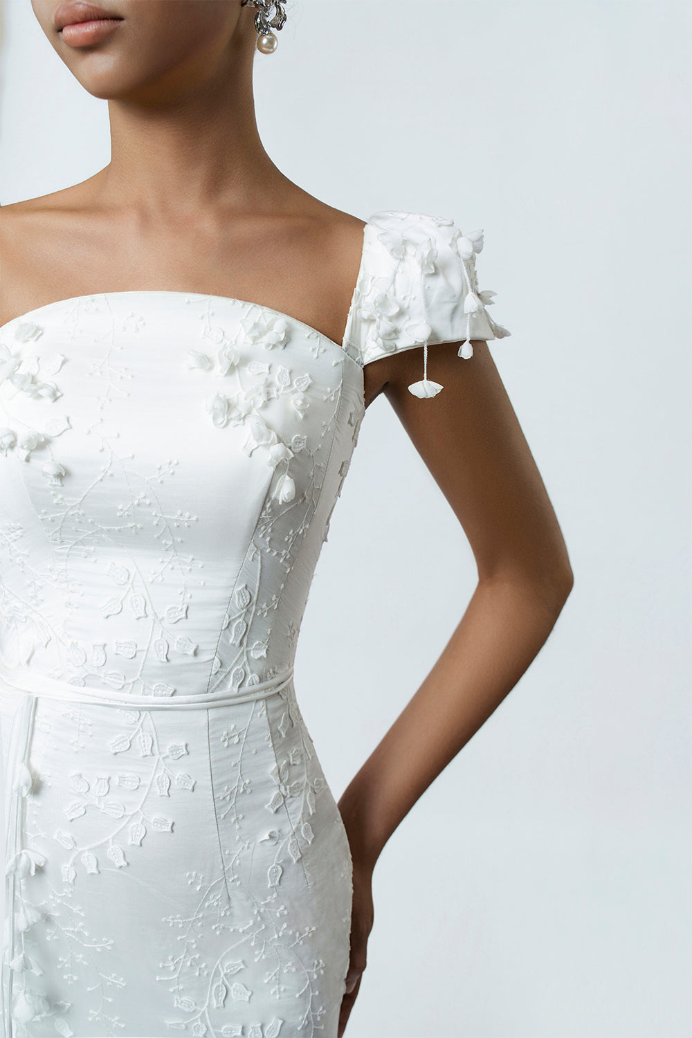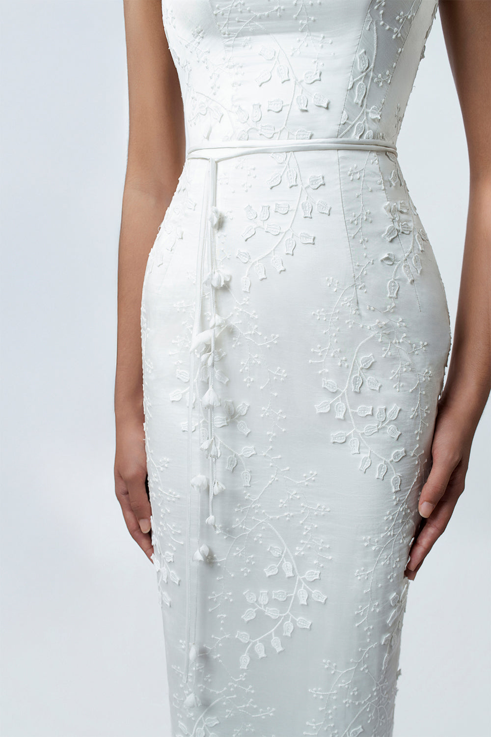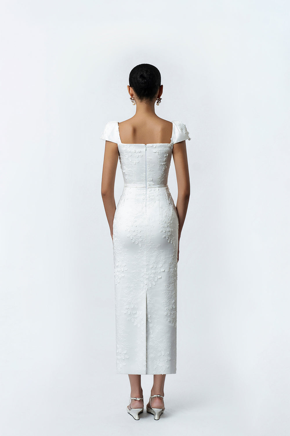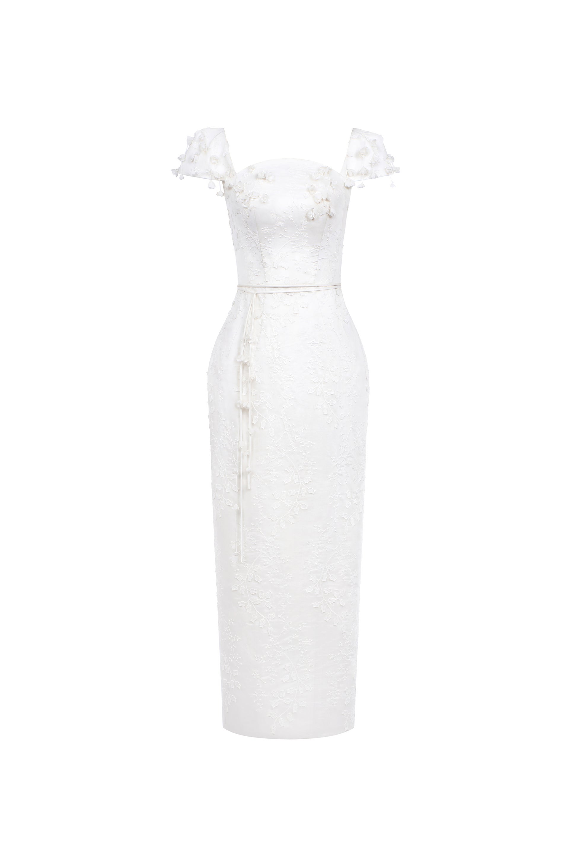 A pencil maxi dress crafted from premium embroidered silk featuring raised lily-of-the-valley motifs, delivering soft, pure beauty. The pencil silhouette accentuates natural curves, paired with a sweetheart neckline and pleated shoulders for a feminine, regal yet refined appearance. Hand-embellished lily clusters at the shoulders and bust create striking focal points, adding depth and life to every movement. The hand-knotted floral strand draped asymmetrically at one hip creates a graceful, romantic, and luxurious focal point. Ideal for those who appreciate refined, elegant beauty and artisanal craftsmanship—perfect for parties, weddings, or moments requiring subtle yet distinctive radiance.