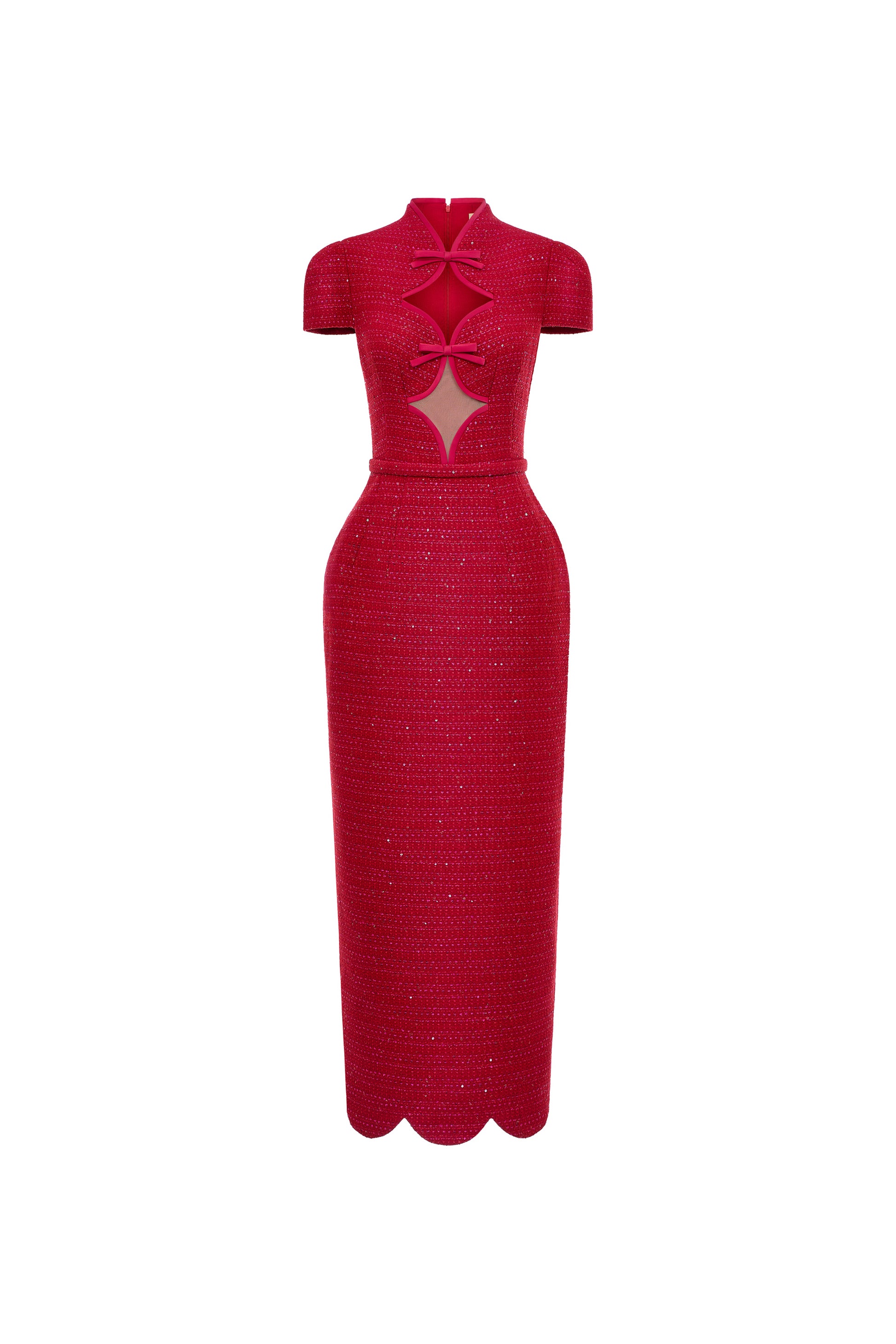 Inspired by the cabaret stage lights of Paris during the Moulin Rouge era, Rouge Dress reimagines seductive beauty with intention through tweed fabric in a fitted pencil silhouette that accentuates body lines. Sharp contours combined with bold cut-out details create captivating visual accents, sensual yet maintaining subtle mystery. Streamlined, striking and impressive overall, perfect for evening parties, events or festive occasions.