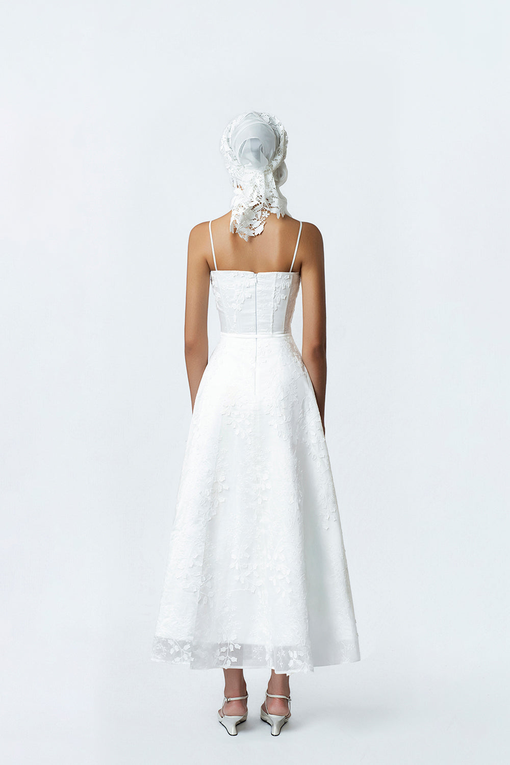 A spaghetti strap maxi dress with A-line silhouette, crafted from embroidered silk featuring raised lily-of-the-valley motifs for a refined, luxurious surface effect. The bodice is adorned with meticulously hand-assembled flower clusters, creating a charming focal point that highlights femininity. With its light, easy-to-wear silhouette, the design provides comfort while accentuating an ethereal, graceful presence. The pristine white shade and soft draping structure help the wearer radiate flowing, elegant, and refined beauty—ideal for light parties, engagement ceremonies, or events with a sophisticated ambiance.