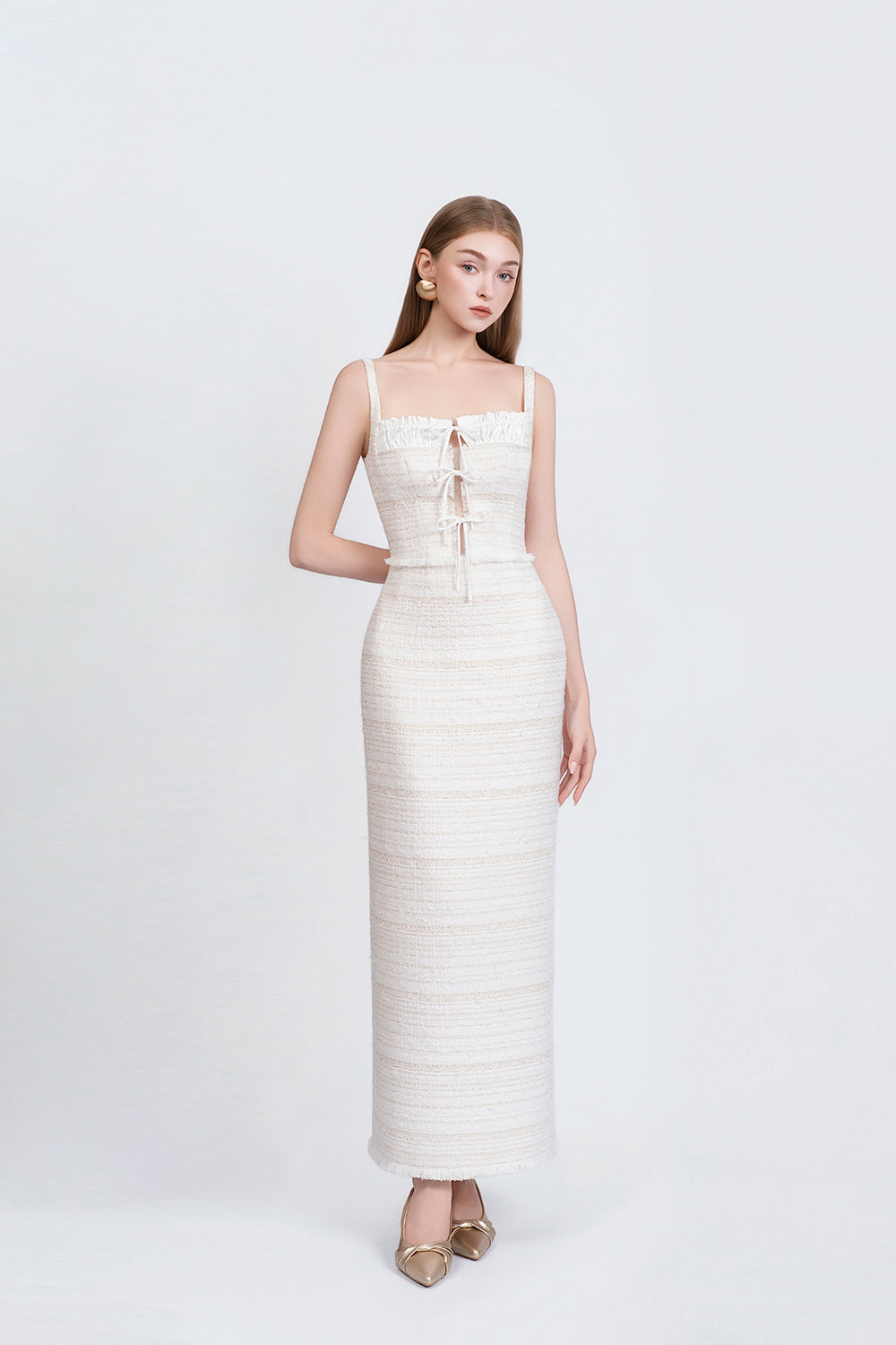 Céleste Dress draws inspiration from the Parisian stage atmosphere during the Moulin Rouge era, where lights, movement and feminine beauty intersected in an enchanting cabaret spirit. The design uses tweed on a streamlined pencil silhouette, flattering the figure and delivering a polished, elegant feel. Creative material combination with subtly restrained cut-out details, combined with rows of bows running down the front create visual accents, guiding the eye along the body's length. Sophisticated yet subtly captivating overall, perfect for evening parties, events and festive occasions where elegant beauty is expressed with confidence and aesthetic depth.