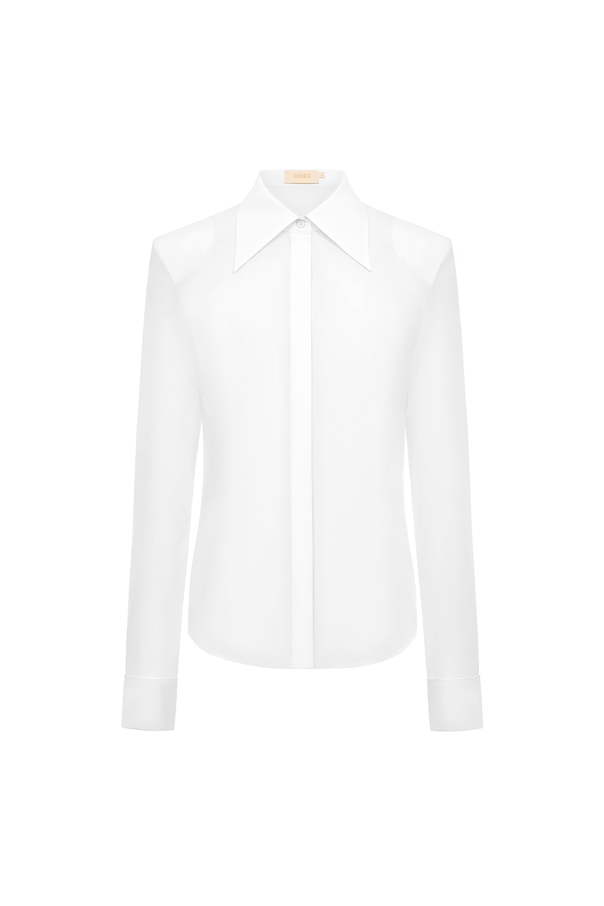 Inspired by glamorous Paris during the Moulin Rouge era, this design embodies timeless elegance, balancing classic and modern aesthetics. The product features soft, breathable Tencel fabric with a comfortable fitted silhouette. The sharp pointed collar combined with concealed button placket creates a minimalist yet refined look, enhanced by cuff details and pearl cufflinks for a sophisticated, elegant accent. Versatile design, suitable for layering under jackets or blazers, or pairing with trousers and skirts for various occasions from work to leisure.